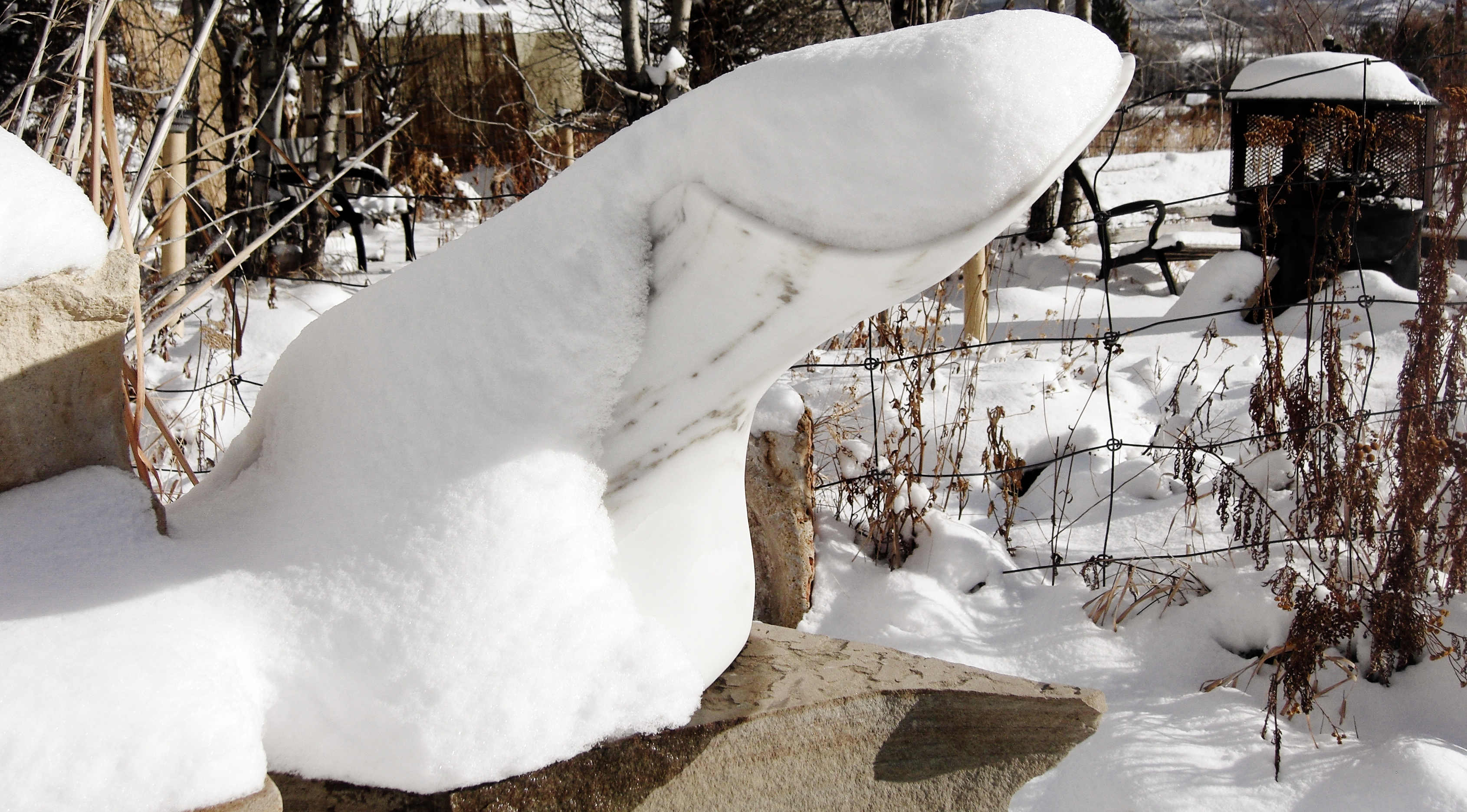 'Thing Two, Starboard', wrapped in snow, Collection Series Marble Sculpture by Martin Cooney.