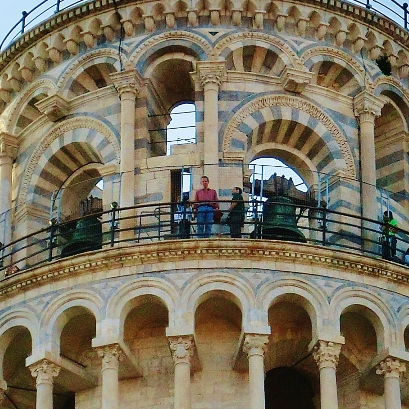 Telephoto view of Tourists Atop The Leaning Tower of Pisa, Italy, on the North West Tuscan Way by Martin Cooney