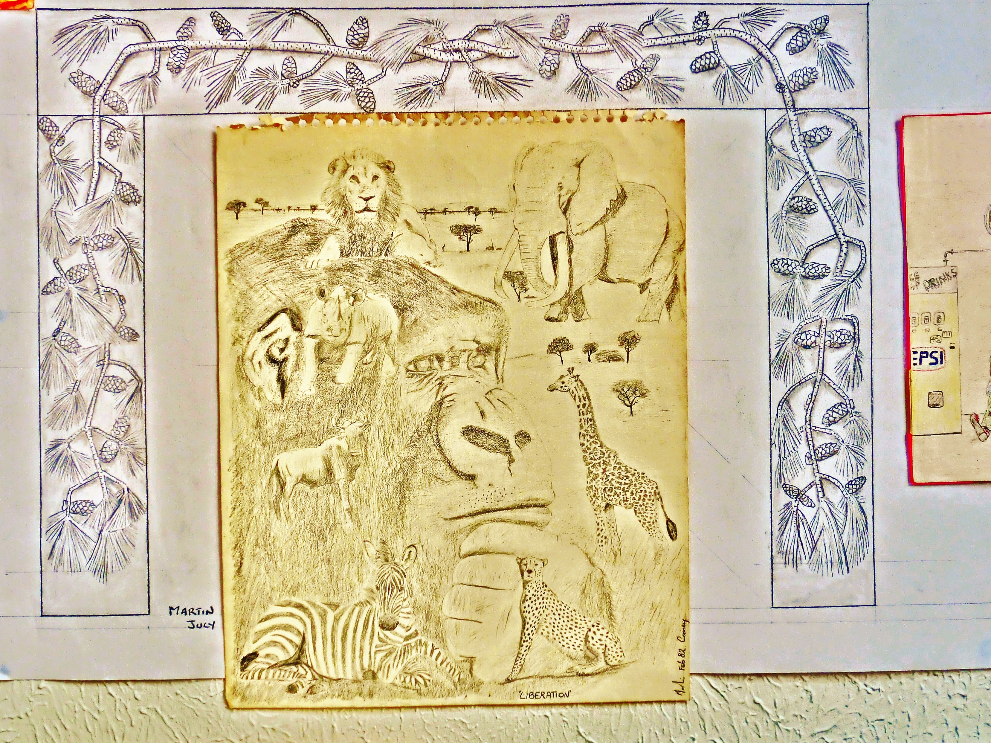 ‘Liberation’, set within pine cone fireplace, both pencil, Early Eighties, Martin Cooney.