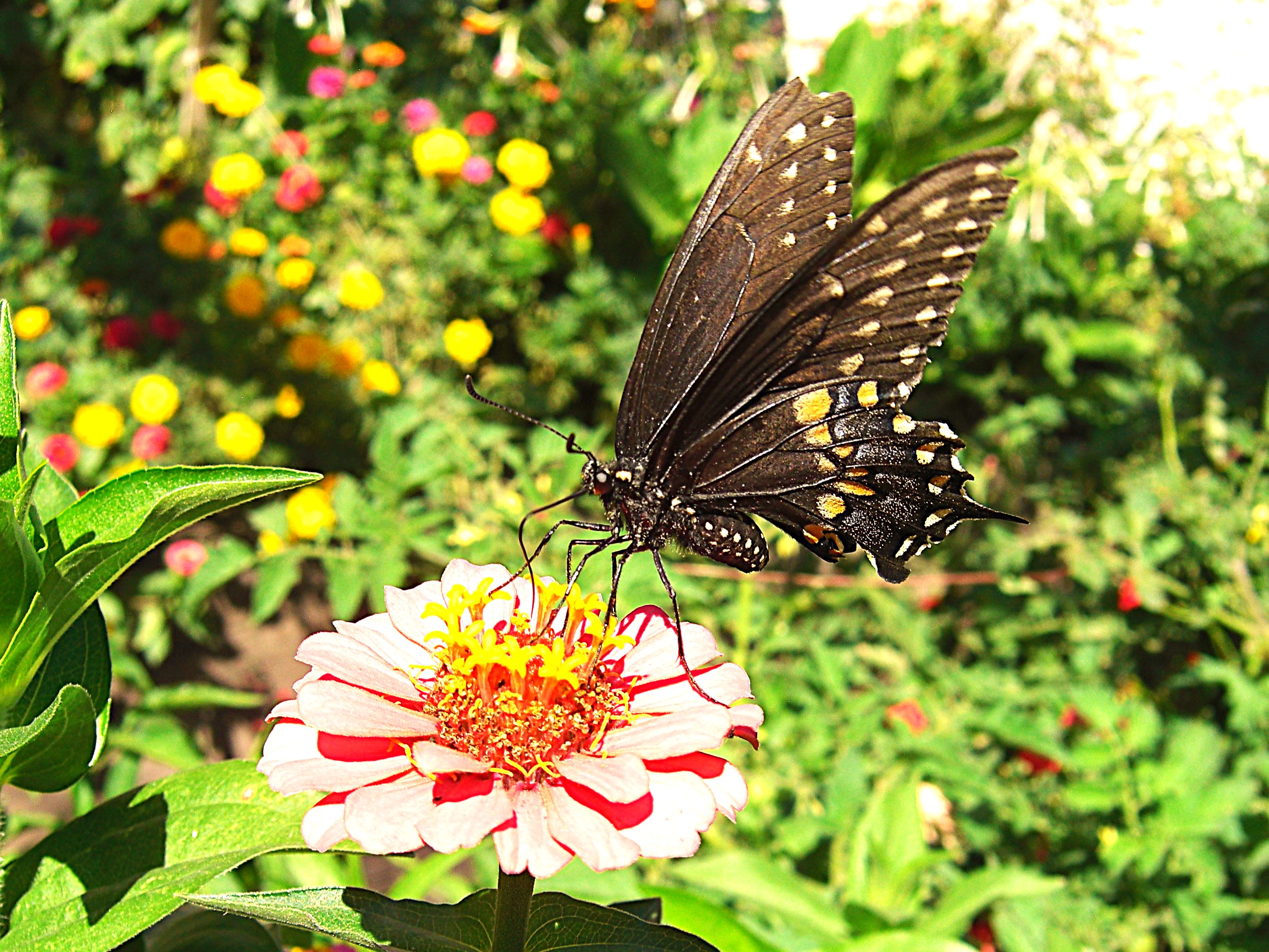 Strange Black BUtterfly Lands Upon Pinky Yellow Zinnea, Walled Garden of Alta Vista, Summer 2024.