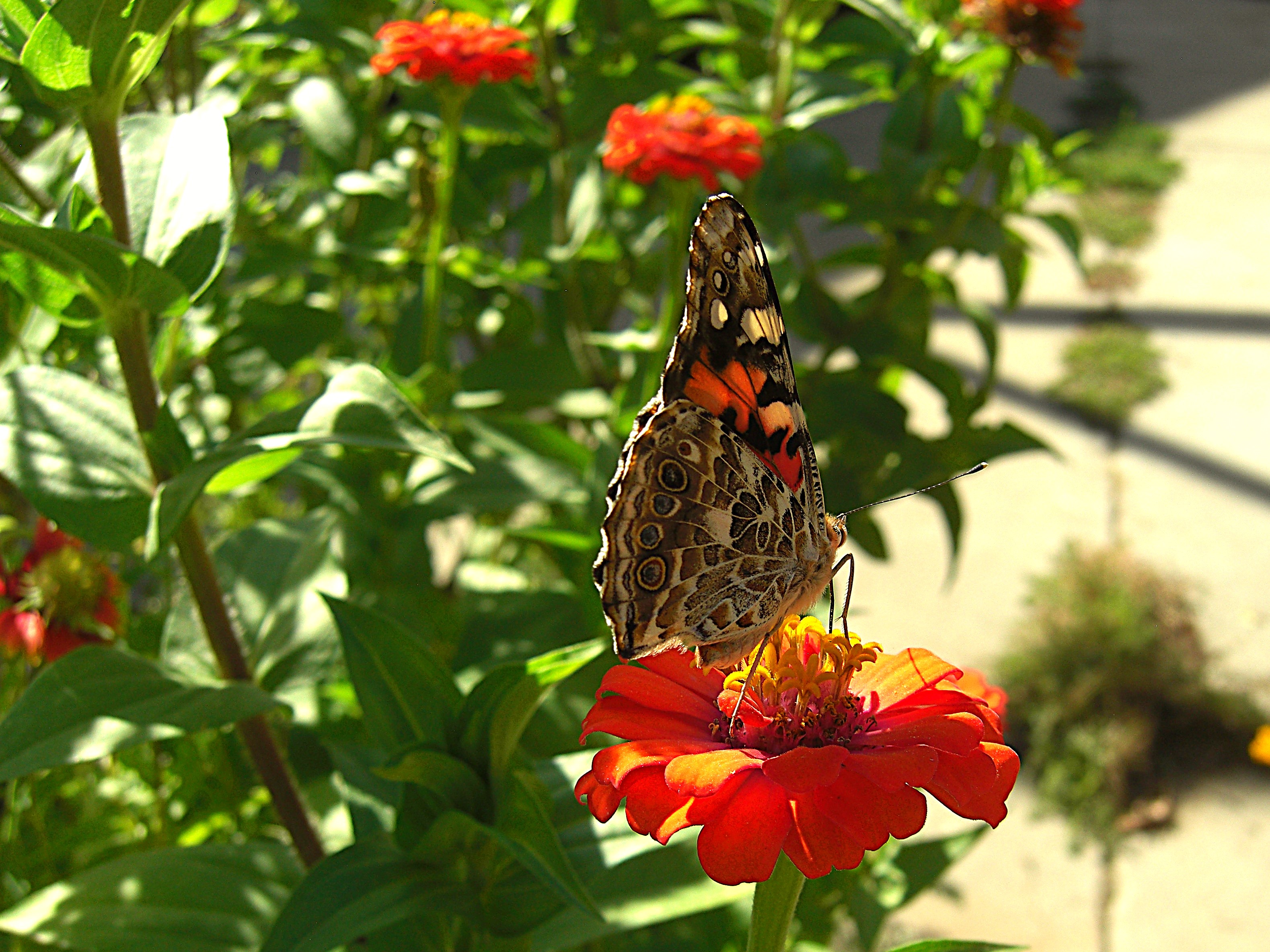 Tentative Monarch Butterfly Probes Orange Zinnea, Walled Garden of Alta Vista, Summer 2024.